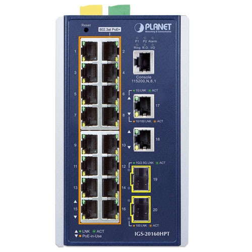 El Switch PoE+ Administrable industrial PLANET IGS-20160HPT L3, que cuenta con 16 puertos PoE+ 10/100/1000BASE-T 802.3at cada puerto con una potencia de hasta 36 vatios, 2 puertos RJ45 10/100/1000BASE-T y 2 puertos SFP 100/1000/2500BASE-X en una carcasa metálica resistente IP30, se puede instalar en cualquier entorno difícil. Proporciona interfaces de administración IPv6 / IPv4 avanzadas y fáciles de usar, abundantes funciones de conmutación L2 / L4, capacidad de enrutamiento dinámico OSPFv2 de capa 3 y tecnología avanzada ITU-G.8032 ERPS Ring para mejorar la capacidad de autorrecuperación rápida y las funciones PoE inteligentes PLANET para controlar la vigilancia IP exterior PoE y las aplicaciones de red inalámbrica. Es capaz de funcionar de forma fiable, estable y silenciosa en el rango de temperatura de -40 a 75 grados C.