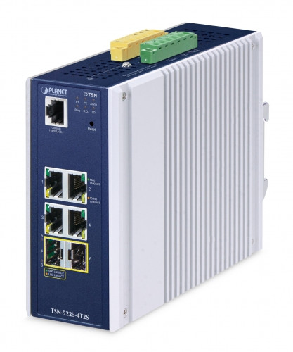 PLANET TSN-5225-4T es un nuevo Switch Ethernet Administrable de red sensible al tiempo (TSN) de capa 2+ de grado industrial que cuenta con 4 puertos RJ45 10/100/1000BASE-T en una carcasa metálica resistente IP30 para un funcionamiento estable en entornos pesados, y aborda todos los niveles de la red de automatización industrial, desde el bus de campo hasta la red troncal de fábrica. Y garantiza la transmisión de extremo a extremo de tráfico de alta prioridad con una latencia extremadamente baja.